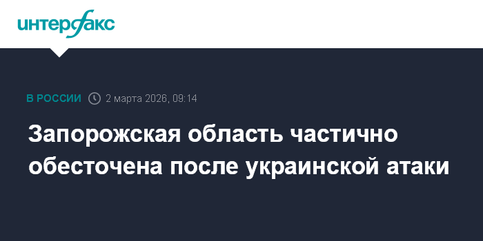 Москва. 2 марта. INTERFAX.RU - Электроснабжение нарушено в четырех муниципалитетах Запорожской области в результате атаки со стороны ВСУ, сообщили в Минэнерго региона в понедельник.