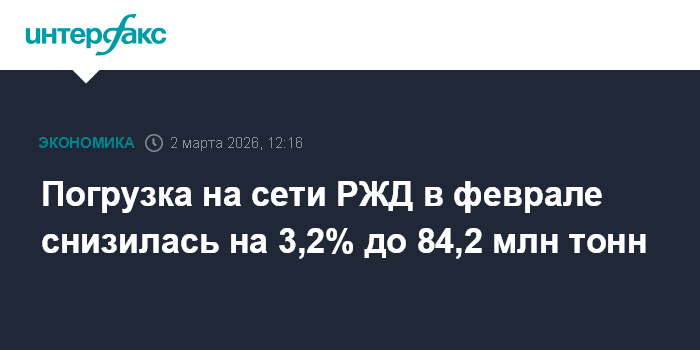 Москва. 2 марта. INTERFAX.RU - По оперативной информации, погрузка на сети ОАО "Российские железные дороги" в феврале составила 84,2 млн тонн, что на 3,2% меньше, чем за аналогичный период прошлого года, сообщила компания.