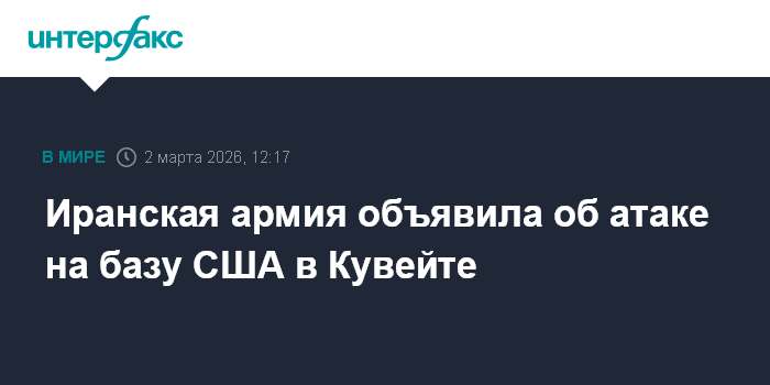 Москва. 2 марта. INTERFAX.RU - Армия Ирана в понедельник заявила, что нанесла удар по базе США "Али ас-Салем" в Кувейте, сообщают западные СМИ.