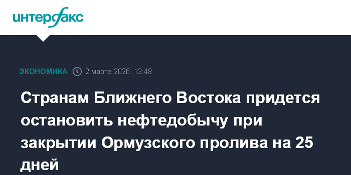 Странам Ближнего Востока придется остановить нефтедобычу при закрытии Ормузского пролива на 25 дней
