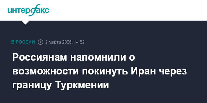 Москва. 2 марта. INTERFAX.RU - Граждане России, которые не могут покинуть Иран из-за сложившейся обстановки прямыми авиарейсами, могут выехать на машине в Туркменистан - на погранпереходе "Сарахс", сообщило российское посольство в Ашхабаде.
