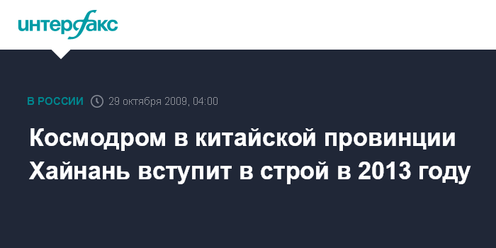 Пекин. 29 октября. ИНТЕРФАКС - Новый китайский космодром "Вэньчан" в южной островной провинции Хайнань вступит в строй в 2013 году, сообщил китайским журналистам один из руководителей строительства Ван Канцян.