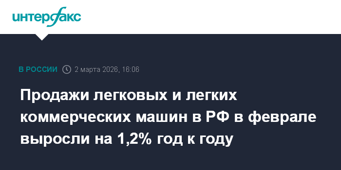 Москва. 2 марта. INTERFAX.RU - Российский рынок новых легковых и легких коммерческих (LCV) автомобилей в феврале 2026 года символически подрос год к году, показав снижение в помесячном выражении, свидетельствуют данные Минпромторга на основании регистраций ЭПТС от АО "Паспорт промышленный консалтинг" (совместное предприятие "Автостата" и оператора ЭПТС).