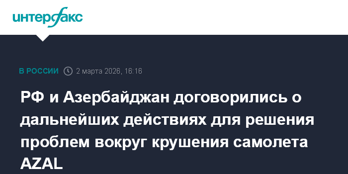 Москва. 2 марта. INTERFAX.RU - Россия и Азербайджан договорились о дальнейших действиях для разрешения проблем, возникших после крушения самолета Embraer 190 Azerbaijan Airlines (AZAL), заявил вице-премьер РФ Алексей Оверчук.
