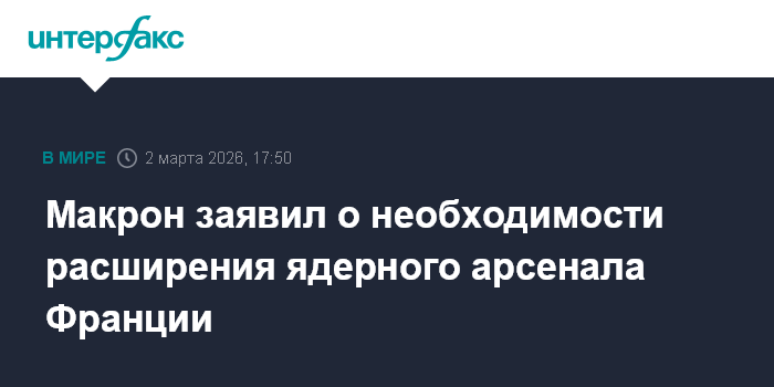 Москва. 2 марта. INTERFAX.RU - Президент Франции Эммануэль Макрон в понедельник заявил, что считает чрезвычайно важным расширение ядерного арсенала страны.