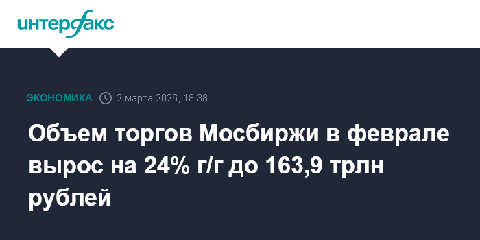 По сравнению с январем 2026 года объем торгов вырос на 25%, со 131,1 трлн рублей.