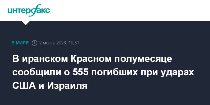 Москва. 2 марта. INTERFAX.RU - По меньшей мере 555 человек погибли с субботы при ударах США и Израиля по Ирану, сообщает в понедельник телеканал Press TV со ссылкой на Общество Красного полумесяца Исламской Республики.