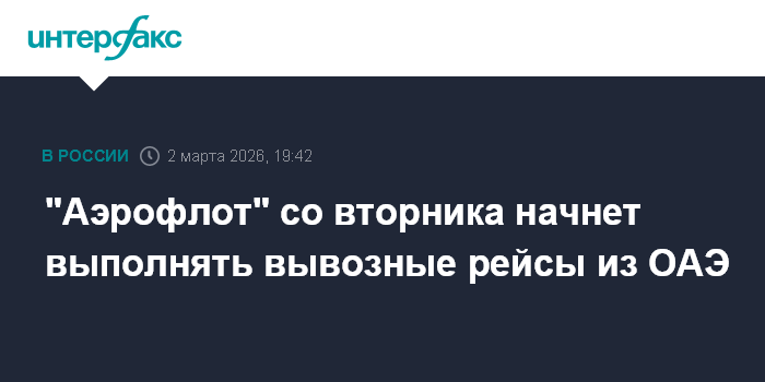 Москва. 2 марта. INTERFAX.RU - "Аэрофлот" во вторник планирует выполнить три вывозных рейса из ОАЭ, сообщила компания.