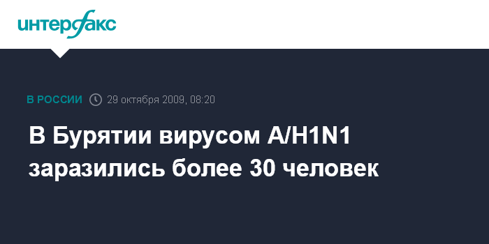 Москва. 29 октября. INTERFAX.RU - В Республике Бурятия за сутки отмечено десять новых случаев заражения вирусом А/H1N1. Таким образом, количество больных свиным гриппом возросло до 33 человек.