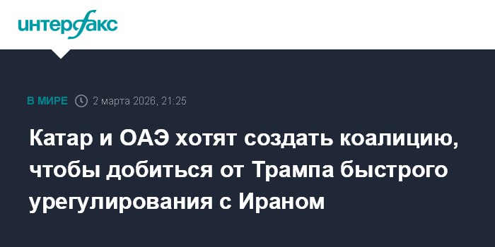 Москва. 2 марта. INTERFAX.RU - Катар и ОАЭ предпринимают усилия по созданию коалиции, чтобы убедить президента США Дональда Трампа быстро урегулировать конфликт с Ираном путем дипломатии, сообщает в понедельник Bloomberg со ссылкой на источники.