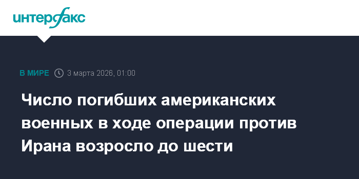 Москва. 3 марта. INTERFAX.RU - Количество погибших в ходе операции против Ирана американских военных, согласно последним данным, увеличилось до шести человек, сообщило Центральное командование ВС США на Ближнем Востоке (CENTCOM).