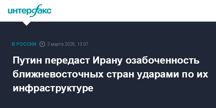 Москва. 3 марта. INTERFAX.RU - Президент РФ Владимир Путин передаст Тегерану сигналы о глубокой озабоченности стран, вовлеченных в конфликт на Ближнем Востоке, в связи с ударами по их инфраструктуре, сообщил пресс-секретарь президента РФ Дмитрий Песков.