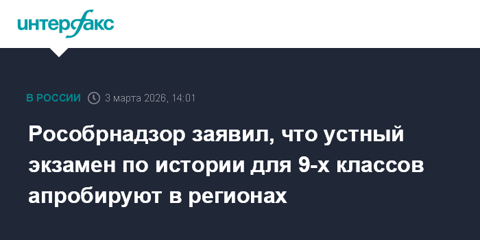 Москва. 3 марта. INTERFAX.RU - Рособрнадзор сообщил, что в ближайшее время Федеральный институт педагогических измерений будет разрабатывать модели проведения обязательного устного экзамена по истории в девятых классах и заданий для него, их апробируют в субъектах РФ.