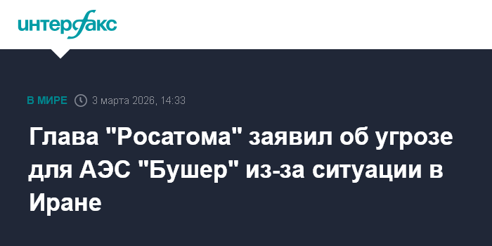 Москва. 3 марта. INTERFAX.RU - Угроза для АЭС "Бушер" существует, поскольку в километрах от линии защиты станции звучат взрывы, направленные на военные объекты; по мере нарастания конфликта угрозы для станции будут расти, заявил глава госкорпорации "Росатом" Алексей Лихачев.