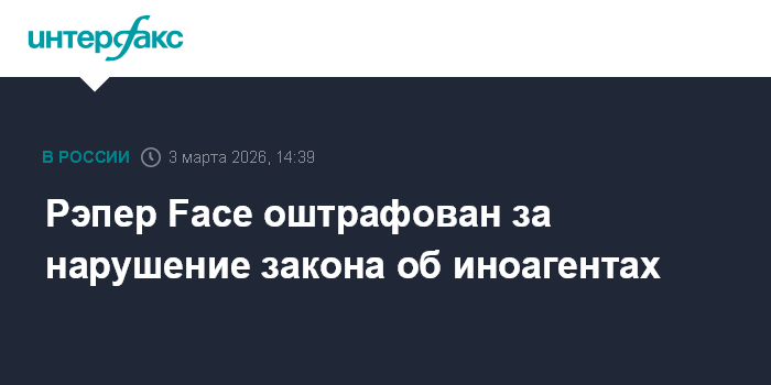 Москва. 3 марта. INTERFAX.RU - Мировой судья Кировского района Уфы заочно оштрафовал Ивану Дрёмину (рэпер Face, признан в России иноагентом) по делу об уклонении от исполнения обязанностей иностранного агента, сообщила прокуратура Башкирии.