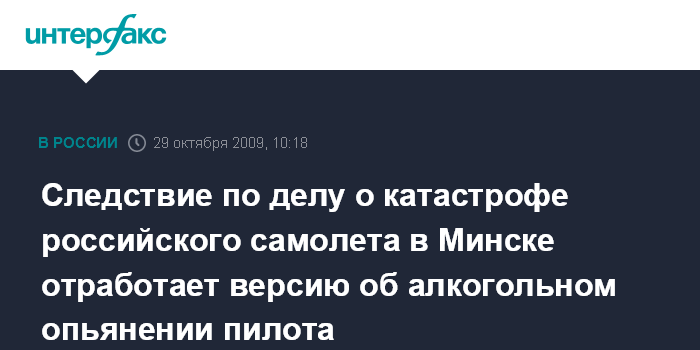 Москва. 29 октября. INTERFAX.RU - Следствие будет отрабатывать все версии катастрофы по делу о крушении самолета "С-ЭЙР", в том числе и алкогольное опьянение человека, управлявшего воздушным судном, сообщили агентству "Интерфакс- Запад" в четверг в Белорусской транспортной прокуратуре.