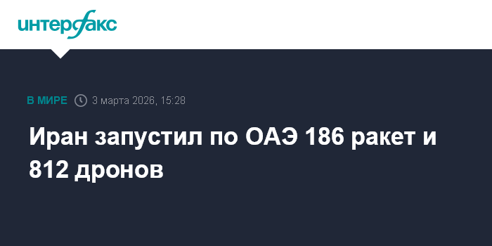 Москва. 3 марта. INTERFAX.RU - В Минобороны ОАЭ заявили во вторник, что с момента начала конфликта в регионе в минувшую субботу из Ирана по территории Эмиратов выпустили 186 ракет и 812 дронов, сообщает телеканал "Аль-Джазира".