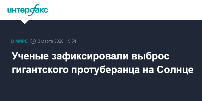Москва. 3 марта. INTERFAX.RU - Выброс крупного протуберанца произошел на Солнце во вторник, никакого влияния на Землю данное событие не окажет, сообщили в лаборатории солнечной астрономии Института космических исследований (ИКИ) и Института солнечно-земной физики (ИСЗФ) РАН.