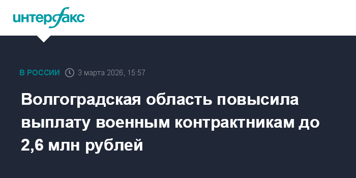 Москва. 3 марта. INTERFAX.RU - В Волгоградской области региональную единовременную выплату при заключении контракта с Министерством обороны увеличили на 500 тысяч рублей, с 2,1 млн до 2,6 млн рублей, сообщает пресс-служба администрации региона. Такое постановление подписал губернатор Андрей Бочаров.