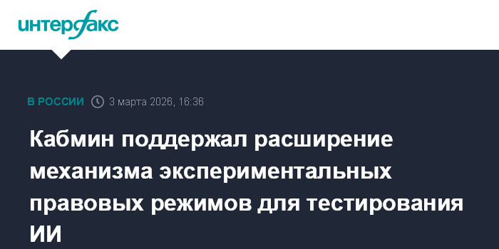 Москва. 3 марта. INTERFAX.RU - Правительство поддержало законопроект об увеличении максимального срока экспериментальных правовых режимов (ЭПР) с трех до пяти лет и возможности их запуска в сферах, где специальное регулирование пока отсутствует, в частности в сфере искусственного интеллекта ИИ.