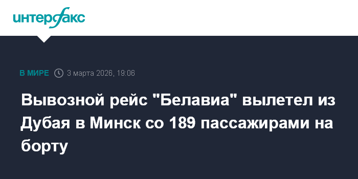 Москва. 3 марта. INTERFAX.RU - Белорусская авиакомпания "Белавиа" во вторник смогла осуществить вывозной рейс из Дубая (ОАЭ), где из-за эскалации ситуации на Ближнем Востоке застряли сотни туристов.