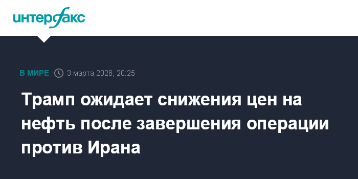 Москва. 3 марта. INTERFAX.RU - Цены на нефть упадут после завершения ударов США по Ирану, заявил во вторник американский президент Дональд Трамп.