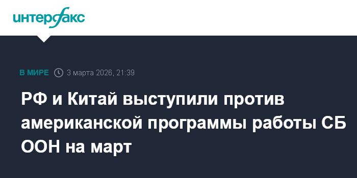 Москва. 3 марта. INTERFAX.RU - Россия и Китай 2 марта выступили против принятия программы работы американского председательства Совета Безопасности ООН в марте из-за наличия в проекте брифинга Комитета 1737 по "санкциям" в отношении Ирана, оснований для возобновления его работы нет, сообщает постпредство России при Организации.