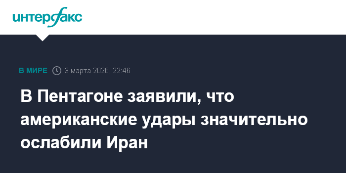 Москва. 3 марта. INTERFAX.RU - Иран в значительной мере ослаблен в результате американской военной операции, заявил во вторник официальный представитель министерства войны США Шон Парнелл.
