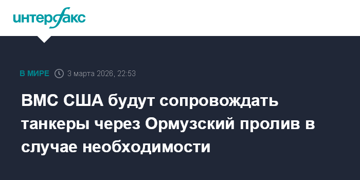 Москва. 3 марта. INTERFAX.RU - ВМС США готовы сопровождать нефтяные танкеры через Ормузский пролив, если в этом будет необходимость, заявил во вторник американский президент Дональд Трамп.