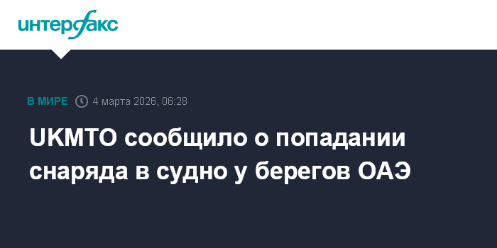 Москва. 4 марта. INTERFAX.RU - Управление морских торговых операций Соединенного Королевства (UKMTO), которое следит за безопасностью на море, сообщило об инциденте с судном у берегов ОАЭ.