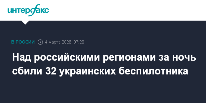Москва. 4 марта. INTERFAX.RU - Минобороны России сообщило об отражении атаки 32 беспилотников ВСУ самолетного типа в ночь со вторника на среду.