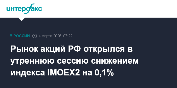 Рынок акций РФ открылся в утреннюю сессию снижением индекса IMOEX2 на 0,1%