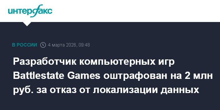 Разработчик компьютерных игр Battlestate Games оштрафован на 2 млн руб. за отказ от локализации данных