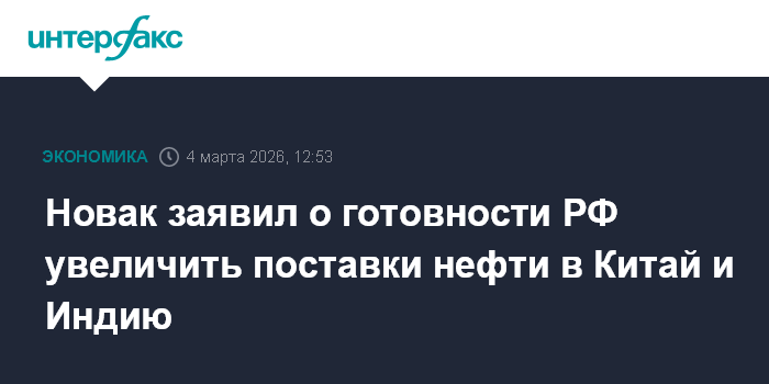 Новак заявил о готовности РФ увеличить поставки нефти в Китай и Индию