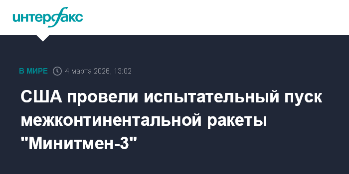Москва. 4 марта. INTERFAX.RU - Соединенные Штаты в среду провели испытательный пуск невооруженной межконтинентальной баллистической ракеты (МБР) Minuteman III в район Тихого океана, сообщило американское Командование глобального удара ВВС США.