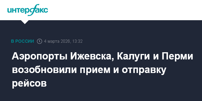 Москва. 4 марта. INTERFAX.RU - Для аэропортов Ижевска, Калуги ("Грабцево") и Перми ("Большое Савино") отменили ограничения на прием и отправку самолетов, сообщила Росавиация.