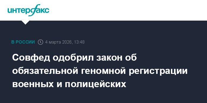 Москва. 4 марта. INTERFAX.RU - Совет Федерации одобрил в среду закон об обязательной государственной геномной регистрации для отдельных категорий лиц, в том числе военных и полицейских.