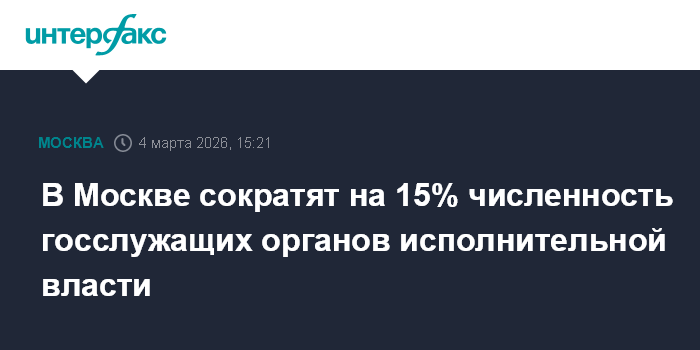 Москва. 4 марта. INTERFAX.RU - В Москве до 1 июня 2026 года сократят на 15% численность государственных гражданских служащих органов исполнительной власти города, а также работников отдельных подведомственных учреждений, выполняющих управленческие функции, сообщил сайт мэра и правительства столицы.