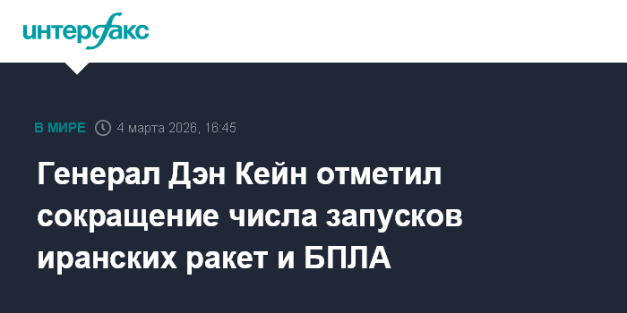 Москва. 4 марта. INTERFAX.RU - Глава Объединенного комитета начальников штабов США Дэн Кейн заявил на брифинге в Пентагоне, что количество ракетных ударов со стороны Ирана снизилось почти на 90% по сравнению с 28 февраля.