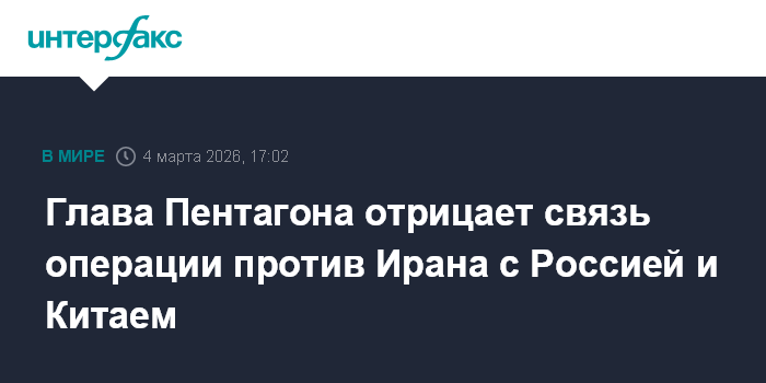 Москва. 4 марта. INTERFAX.RU - Глава Пентагона Пит Хегсет заявил, что операция США против Ирана не обусловлена его партнерскими отношениями с Россией и Китаем, она нацелена исключительно на борьбу с амбициями Ирана обладать ядерным оружием.