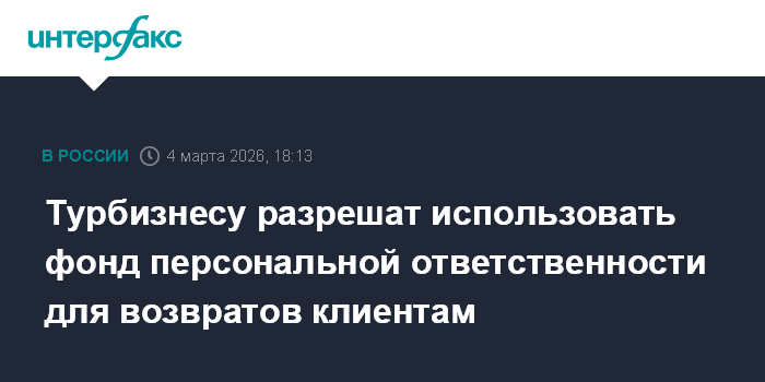 Москва. 4 марта. INTERFAX.RU - Для компенсации потерь туроператоров из-за конфликта на Ближнем Востоке им разрешат использовать фонд персональной ответственности, сообщил на совещании у президента глава Минэкономразвития Максим Решетников.