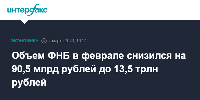 Москва. 4 марта. INTERFAX.RU - Фонд национального благосостояния в феврале 2026 года сократился на 90,5 млрд рублей после роста на 224,1 млрд рублей в январе и 156 млрд рублей в декабре 2025 года, сообщает сайт Минфина.