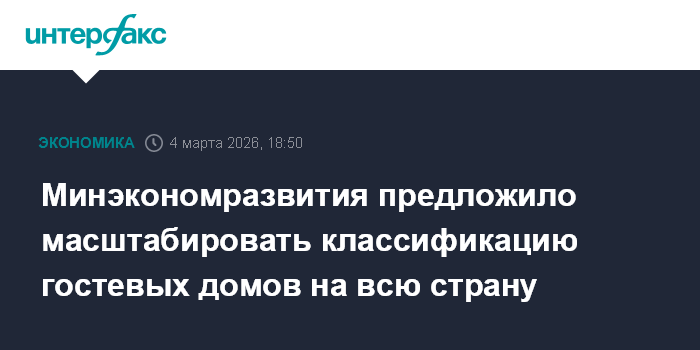 Москва. 4 марта. INTERFAX.RU - С сентября прошлого года в популярных туристических регионах России идет эксперимент по классификации гостевых домов, теперь предлагается распространить механизм на всю страну, сообщил глава Минэкономразвития Максим Решетников.