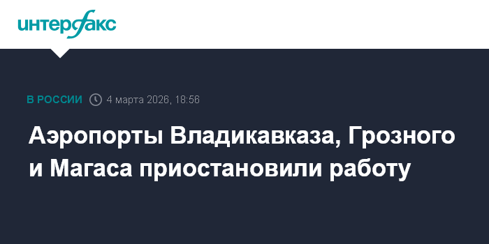 Москва. 4 марта. INTERFAX.RU - Для аэропортов Владикавказа ("Беслан"), Грозного ("Северный") и Магаса ввели ограничения на прием и отправку рейсов, сообщает Росавиация.