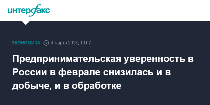 Москва. 4 марта. INTERFAX.RU - Индекс предпринимательской уверенности в добывающих отраслях России в феврале 2026 года снизился на 1,1 процентного пункта (п.п.) - до минус 7,0%, сообщил Росстат.