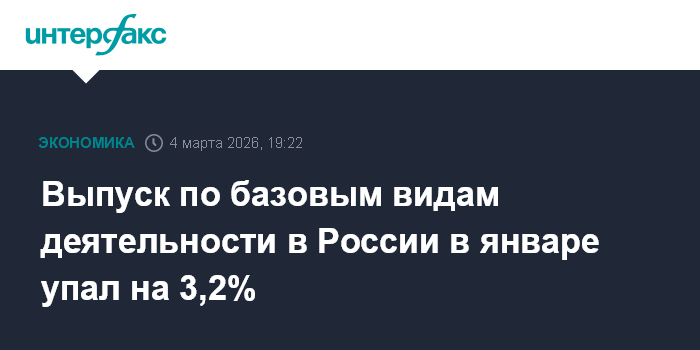 Москва. 4 марта. INTERFAX.RU - В России в январе 2026 года выпуск продукции и услуг по базовым видам экономической деятельности снизился на 3,2% в годовом выражении после увеличения на 4% в декабре 2025 года, сообщил Росстат.