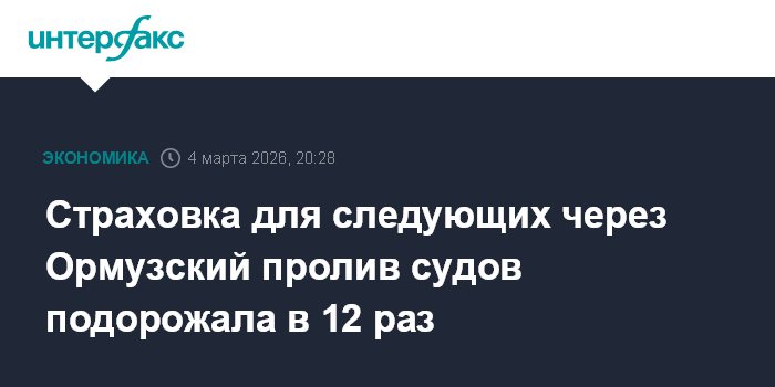 Москва. 4 марта. INTERFAX.RU - Стоимость страховки для судов, проходящих через Ормузский пролив, подскочила в 12 раз, несмотря на обещание президента США Дональда Трампа обеспечить беспрепятственную поставку энергоресурсов из ближневосточного региона, пишет Financial Times со ссылкой на брокеров.