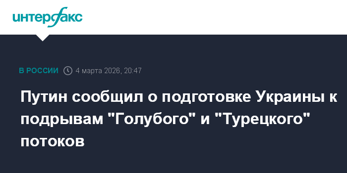 Москва. 4 марта. INTERFAX.RU - По данным российских спецслужб, Киев готовится к подрывам на "Турецком" и "Голубом" потоках при поддержке западных спецслужб, заявил президент России Владимир Путин автору и ведущему программы "Москва. Кремль. Путин" Павлу Зарубину.
