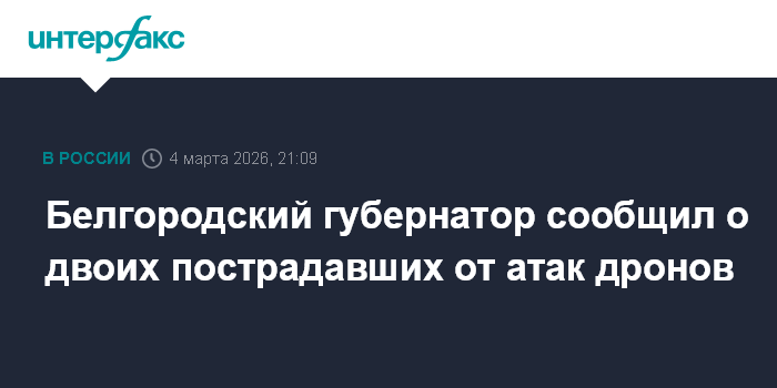 Москва. 4 марта. INTERFAX.RU - В Белгородской области от атак дронов на автомобили ранены двое, сообщил губернатор региона Вячеслав Гладков.