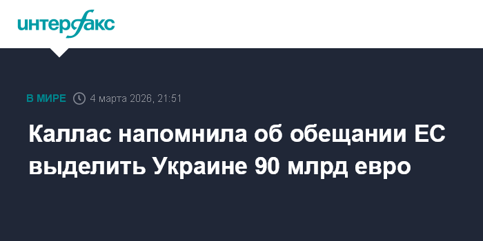 Москва. 4 марта. INTERFAX.RU - Высокий представитель Евросоюза по иностранным делам Кая Каллас заявила на пресс-конференции о необходимости сдержать данное Евросоюзом Киеву обещание предоставить на 2026-2027 годы 90 млрд евро.
